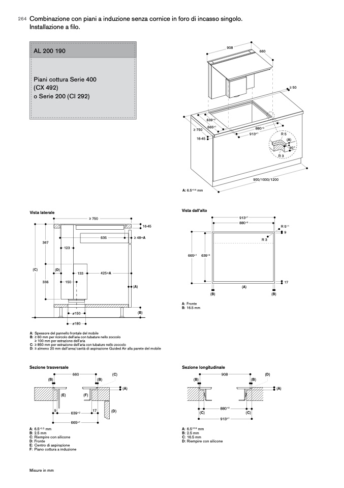 C: ≥ 850 mm per estrazione dell’aria con tubature nello zoccolo