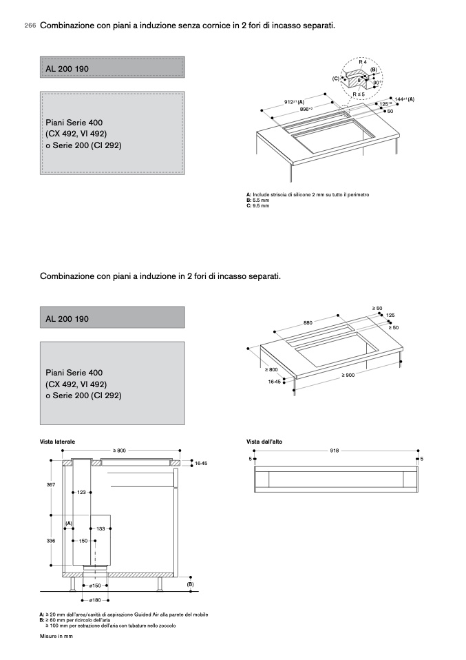 A: ≥ 20 mm dall’area/cavità di aspirazione Guided Air alla parete del mobile