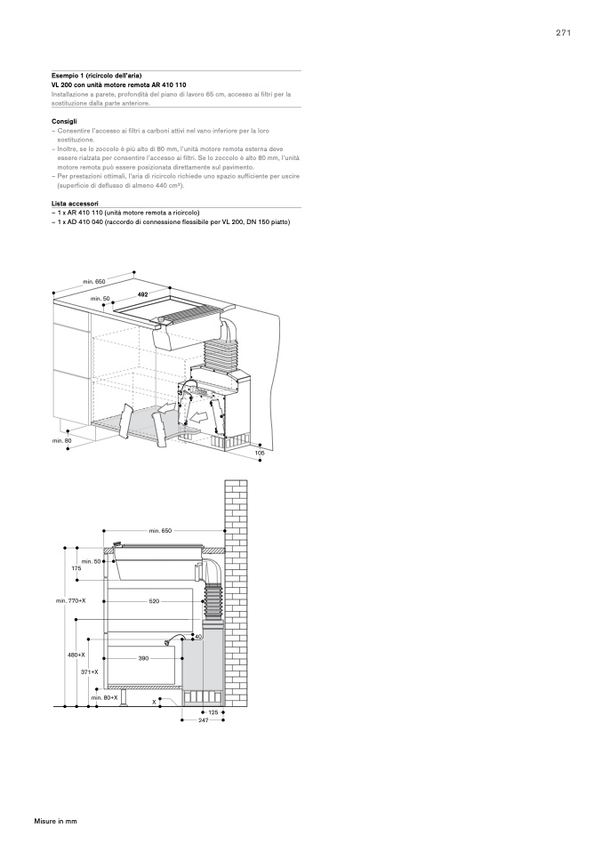 Installazione a parete, profondità del piano di lavoro 65 cm, accesso ai filtri per la