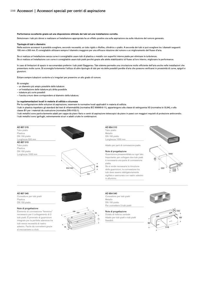 Nella sezione accessori è possibile scegliere, secondo necessità, un tubo rigido o Aluflex, cilindrico o piatto. A seconda dei tubi si può scegliere tra i diametri seguenti: