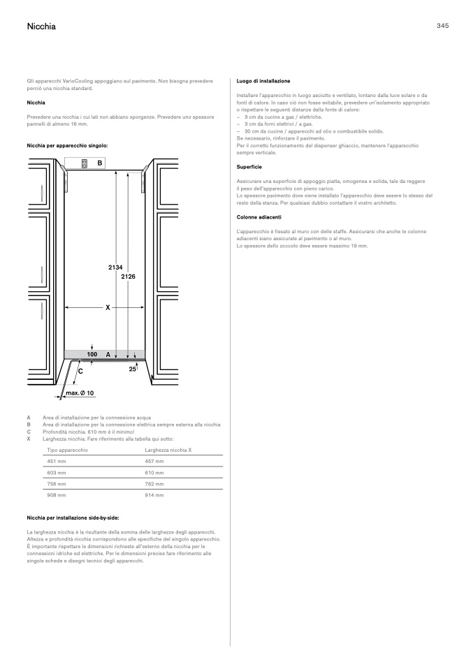 Larghezza nicchia. Fare riferimento alla tabella qui sotto:
