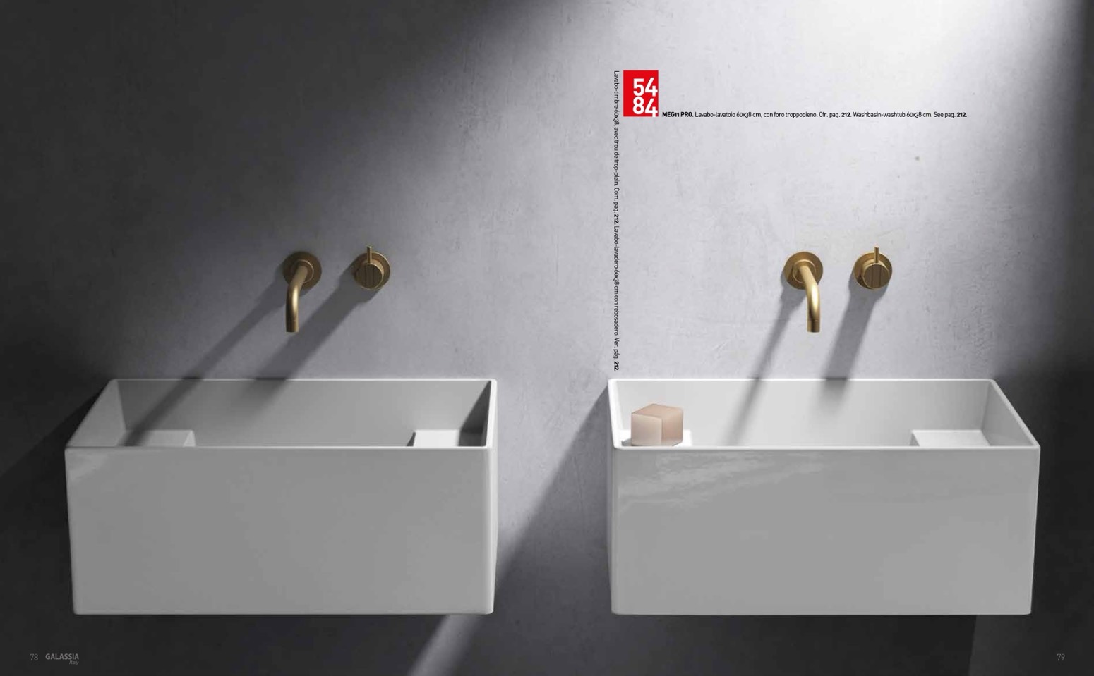 MEG11 PRO. Lavabo-lavatoio 60x38 cm, con foro troppopieno. Cfr. pag. 212. Washbasin-washtub 60x38 cm. See pag. 212.