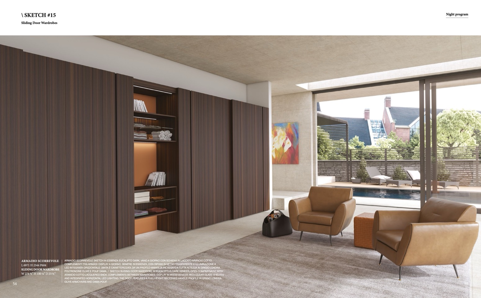 POLTRONCINE OLIVE E POUF DAMA. / SKETCH SLIDING DOOR WARDROBE IN EUCALYPTUS DARK VENEER, OPEN COMPARTMENT WITH