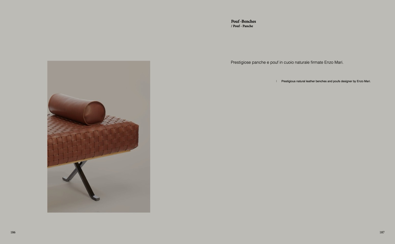 Prestigious natural leather benches and poufs designer by Enzo Mari.