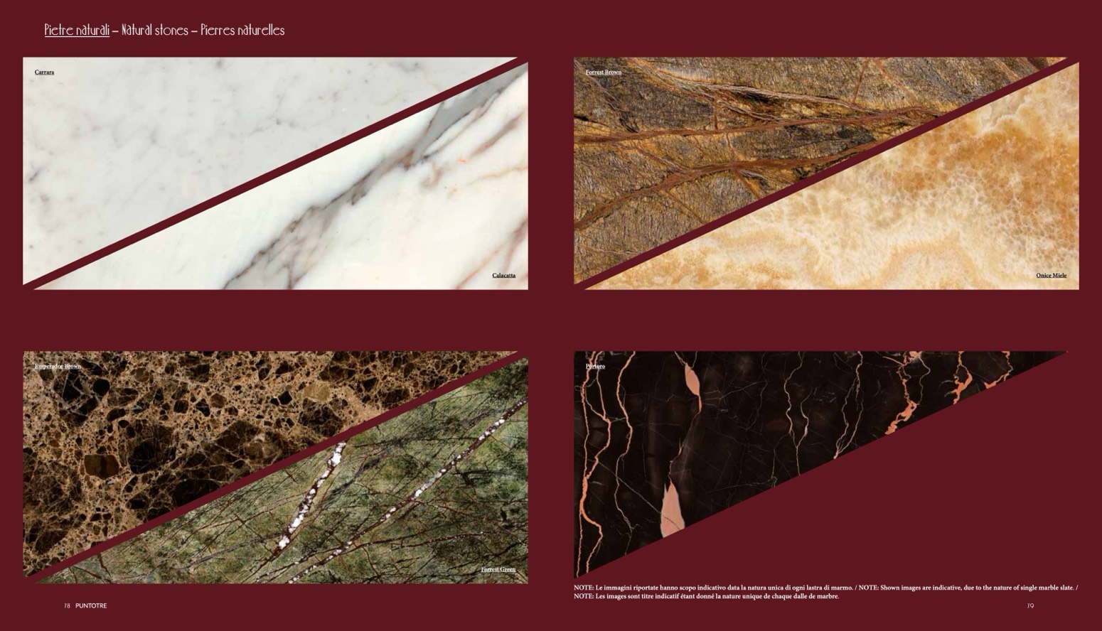 NOTE: Le immagini riportate hanno scopo indicativo data la natura unica di ogni lastra di marmo. / NOTE: Shown images are indicative, due to the nature of single marble slate. /