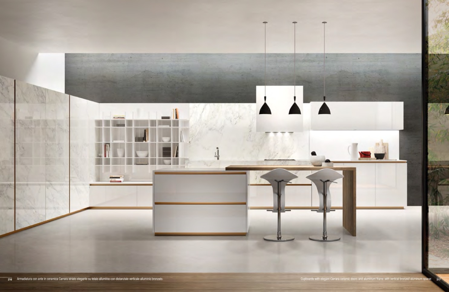 Cupboards with elegant Carrara ceramic doors and aluminum frame with vertical bronzed aluminum spacer. 217