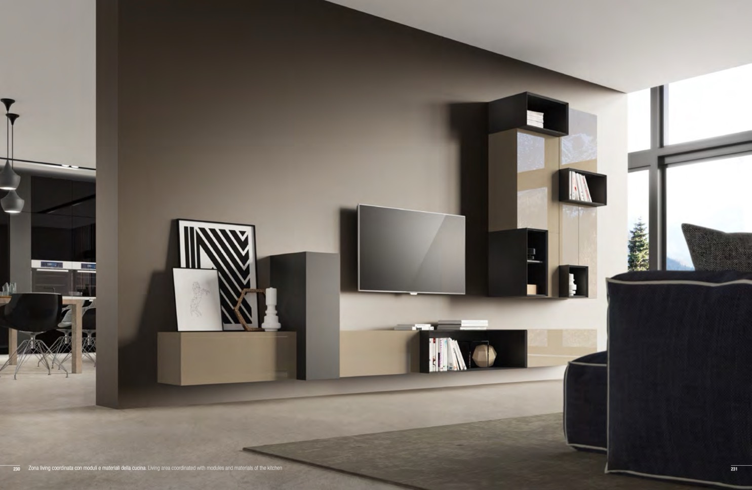Zona living coordinata con moduli e materiali della cucina. Living area coordinated with modules and materials of the kitchen