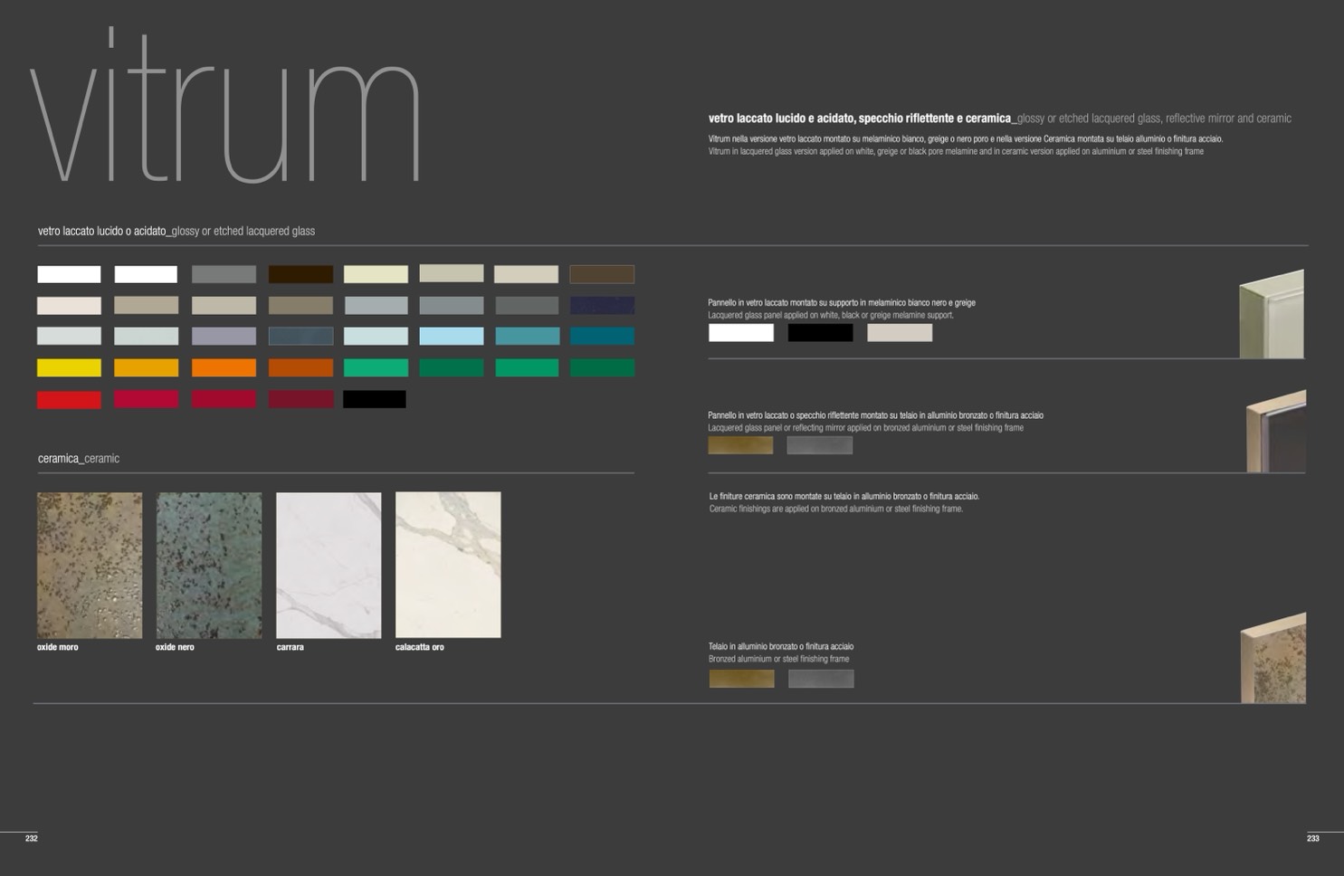 Vitrum nella versione vetro laccato montato su melaminico bianco, greige o nero poro e nella versione Ceramica montata su telaio alluminio o finitura acciaio.