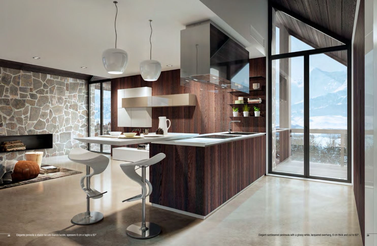 Elegant cantilevered peninsula with a glossy white, lacquered overhang, 6 cm thick and cut to 60°.