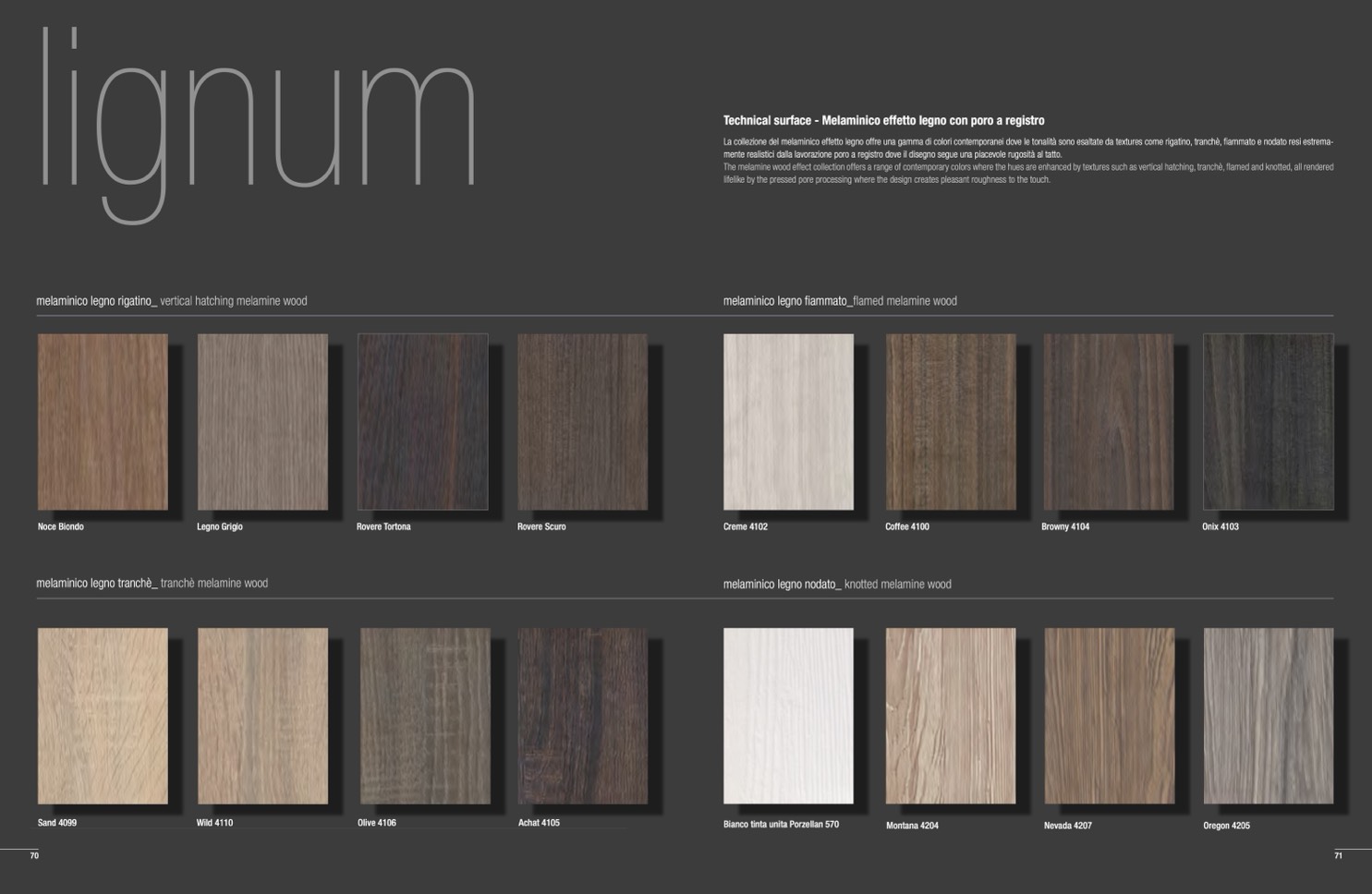 The melamine wood effect collection offers a range of contemporary colors where the hues are enhanced by textures such as vertical hatching, tranchè, flamed and knotted, all rendered
