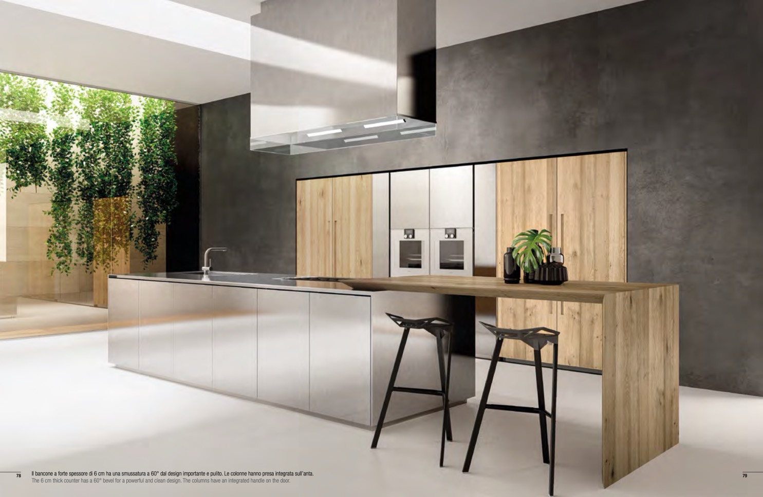 Il bancone a forte spessore di 6 cm ha una smussatura a 60° dal design importante e pulito. Le colonne hanno presa integrata sull’anta.