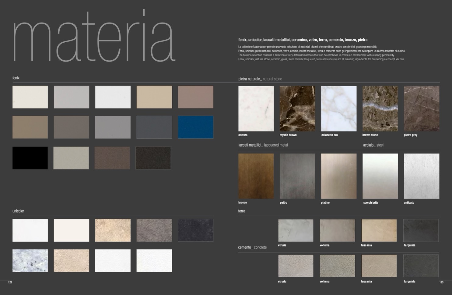 Fenix, unicolor, pietre naturali, ceramica, vetro, acciaio, laccati metallici, terra e cemento sono gli ingredienti per sviluppare un nuovo concetto di cucina.