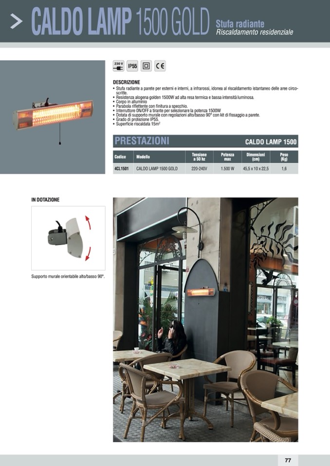 • Stufa radiante a parete per esterni e interni, a infrarossi, idonea al riscaldamento istantaneo delle aree circo-