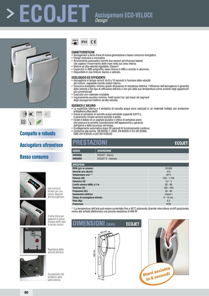 • Asciugamani a lame d’aria di nuova generazione a basso consumo energetico.