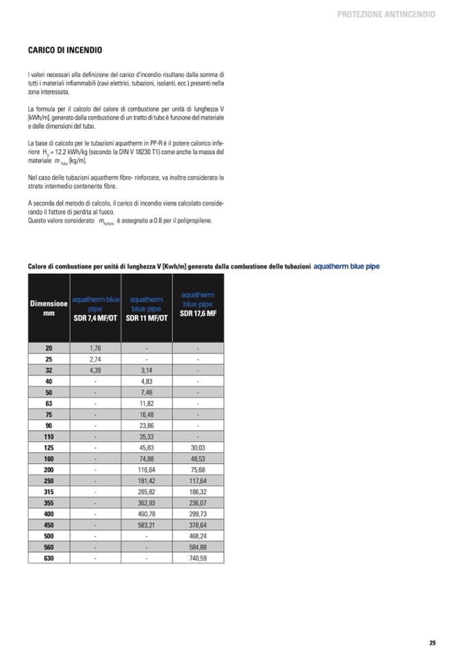 Calore di combustione per unità di lunghezza V [Kwh/m] generato dalla combustione delle tubazioni aquatherm blue pipe