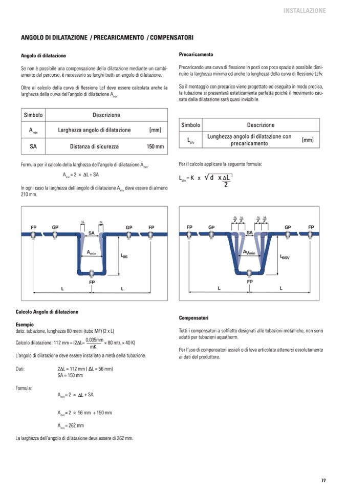 L'angolo di dilatazione deve essere installato a metà della tubazione.