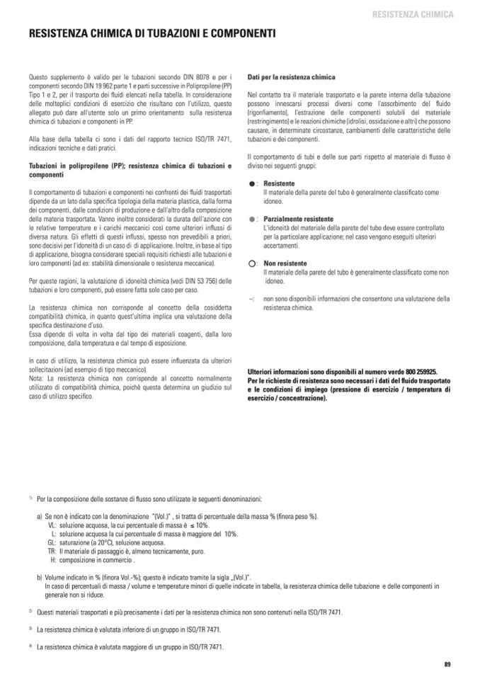 In caso di percentuali di massa / volume e temperature minori di quelle indicate in tabella, la resistenza chimica delle tubazione e delle componenti in
