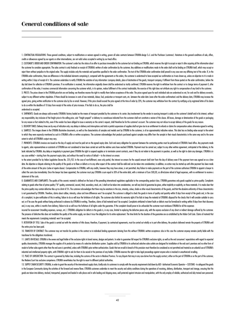 8. GUARANTEES AND COMPLAINTS: The quality of the ceramic material is defined on the basis of the prevailing international regulations applicable to the corresponding product class. ETRURIA guarantees only goods supplied as prime quality. Complaints