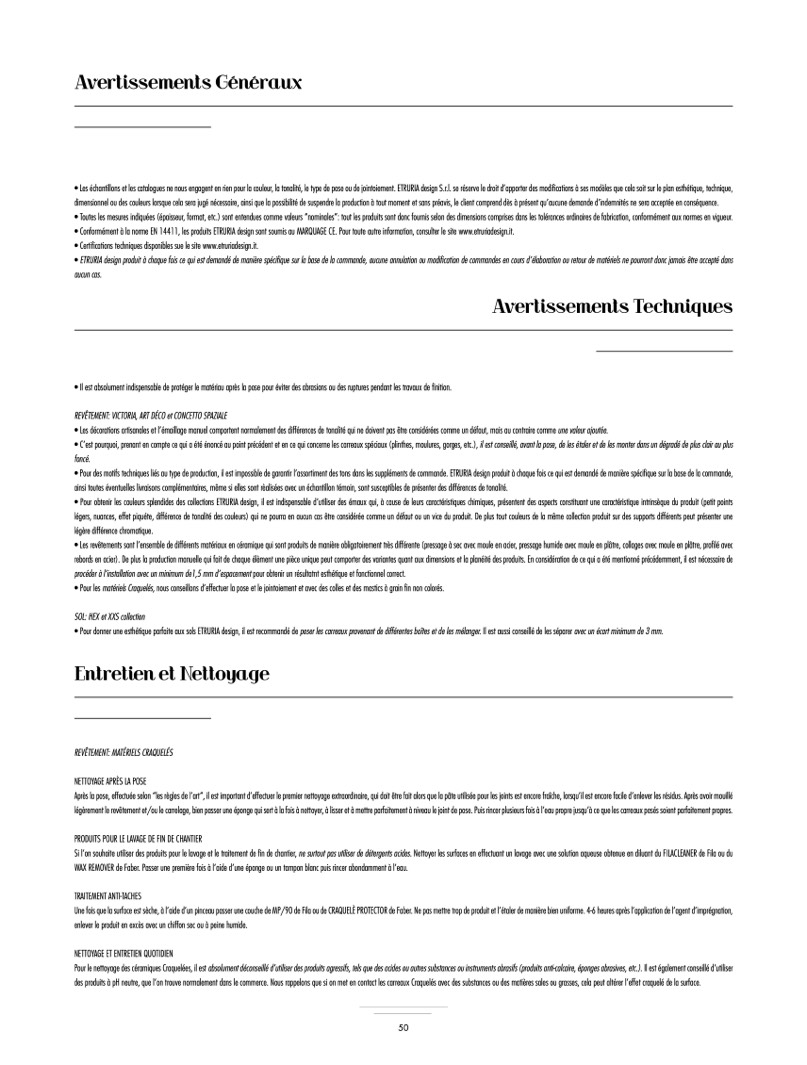 • Les échantillons et les catalogues ne nous engagent en rien pour la couleur, la tonalité, le type de pose ou de jointoiement. ETRURIA design S.r.l. se r