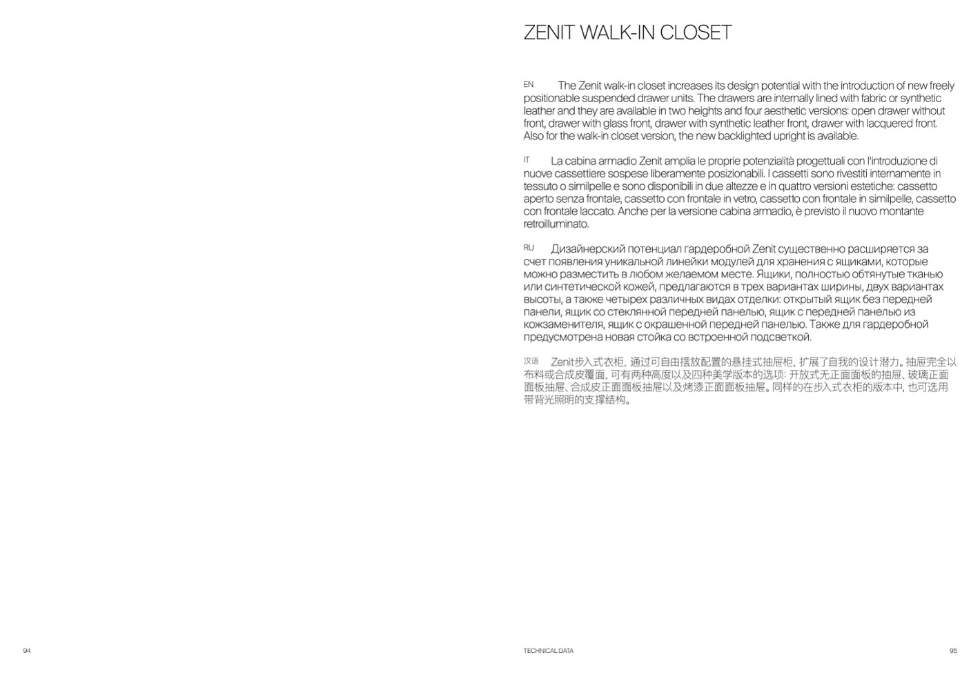 Zenit步入式衣柜,通过可自由摆放配置的悬挂式抽屉柜,扩展了自我的设计潜力。抽屉完全以