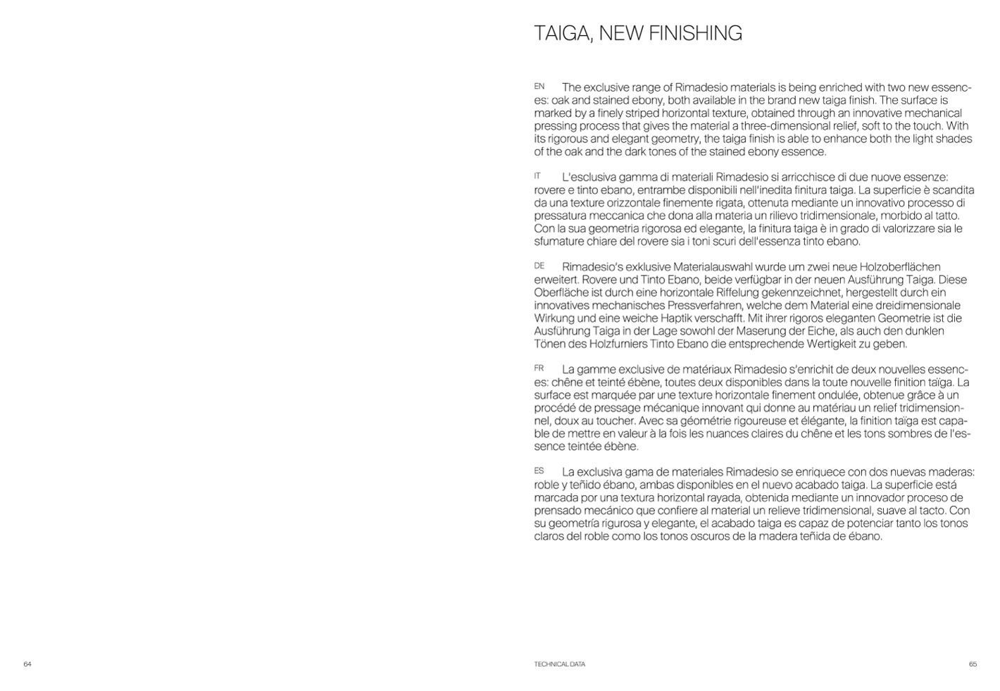 rovere e tinto ebano, entrambe disponibili nell’inedita finitura taiga. La superficie è scandita