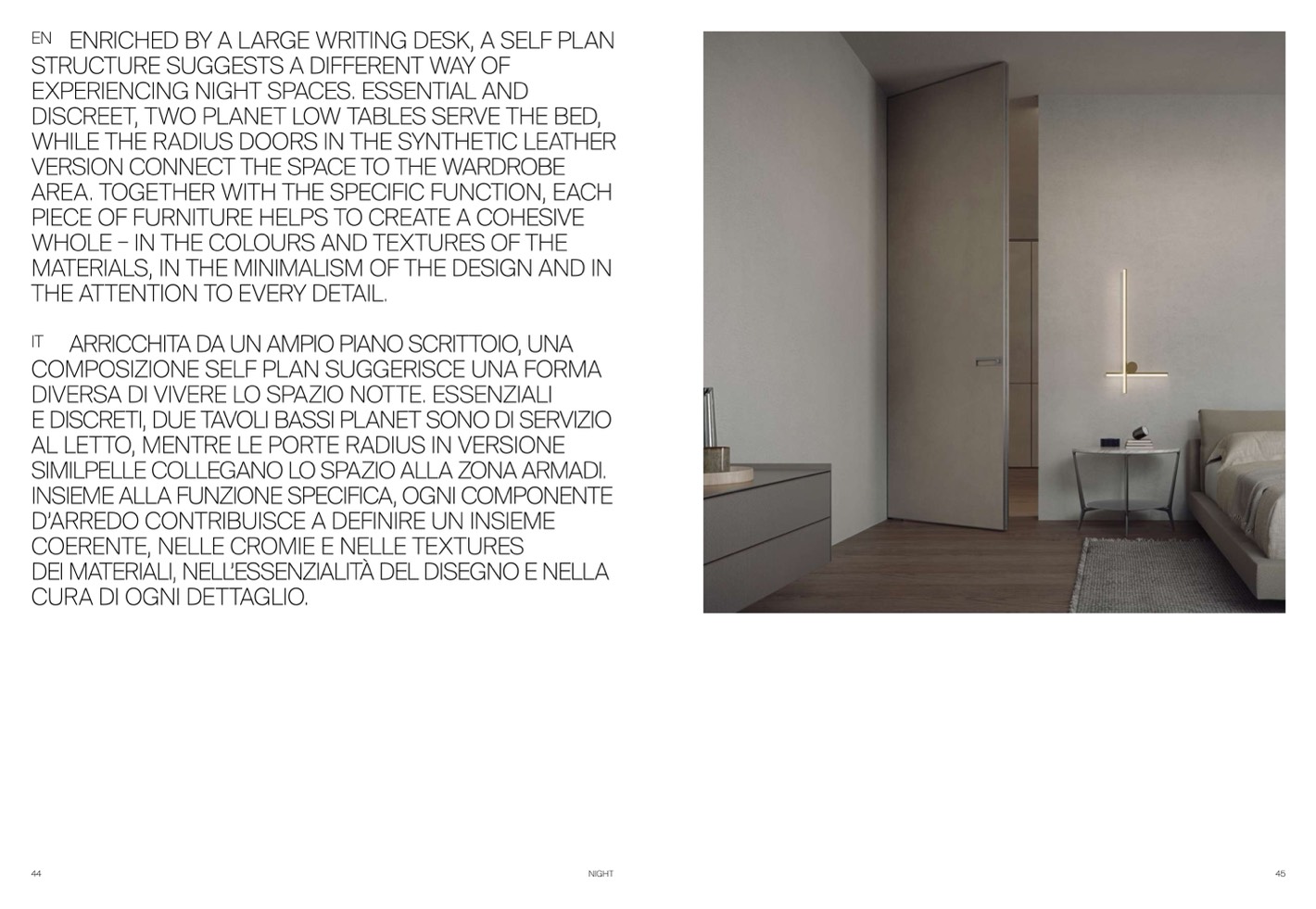 DISCREET, TWO PLANET LOW TABLES SERVE THE BED,