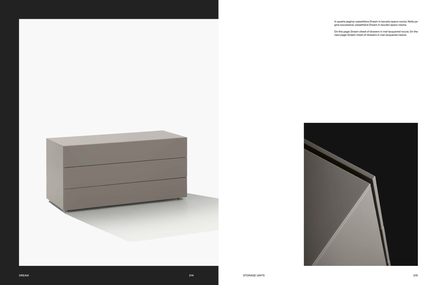 In questa pagina: cassettiera Dream in laccato opaco roccia. Nella pa-