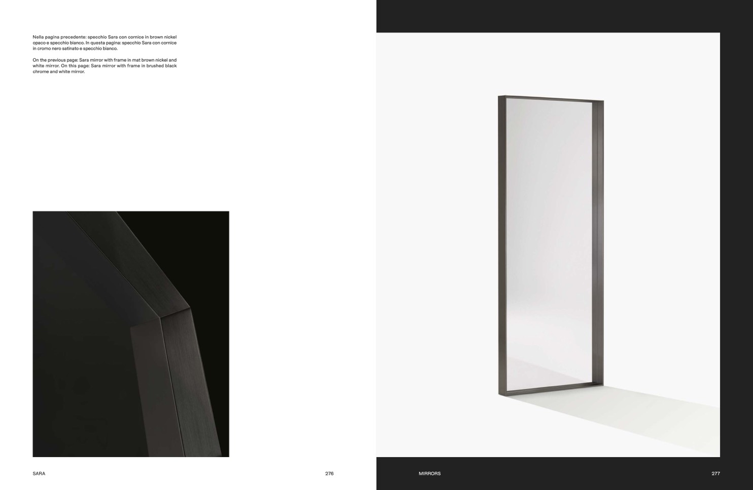 Nella pagina precedente: specchio Sara con cornice in brown nickel