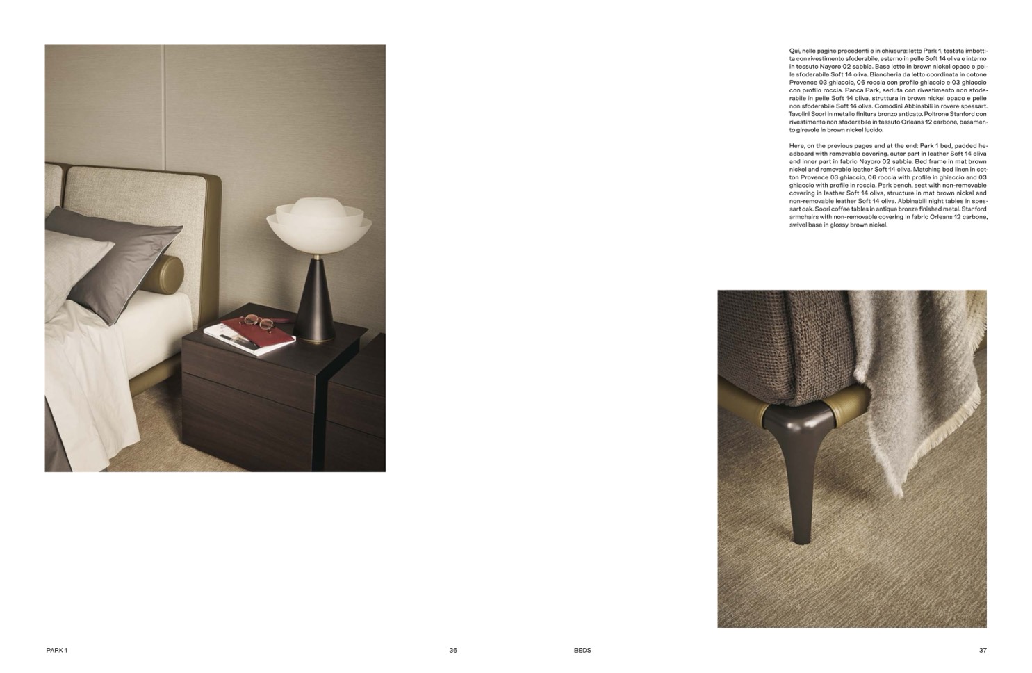 Qui, nelle pagine precedenti e in chiusura: letto Park 1, testata imbotti-