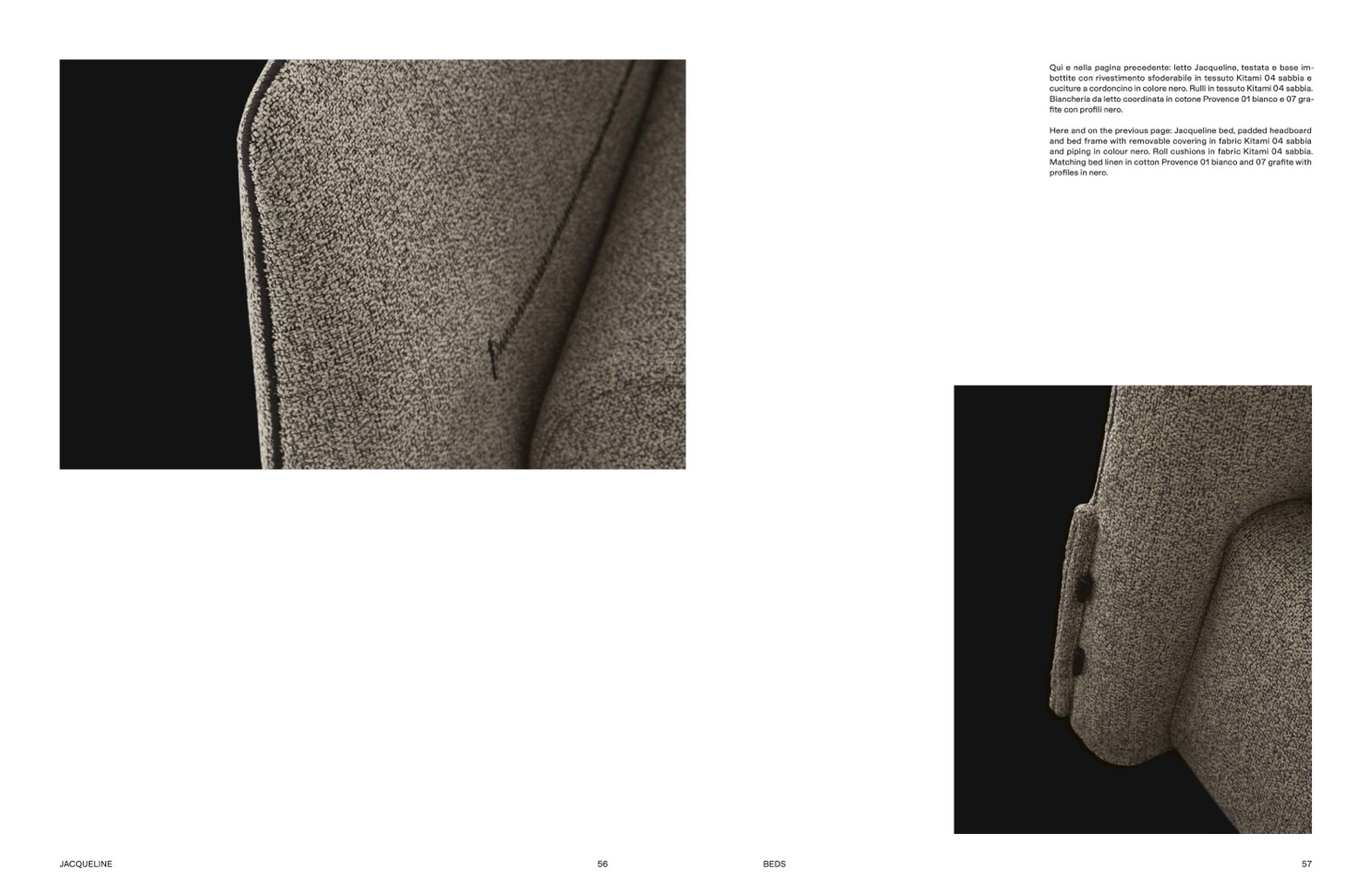 and piping in colour nero. Roll cushions in fabric Kitami 04 sabbia.