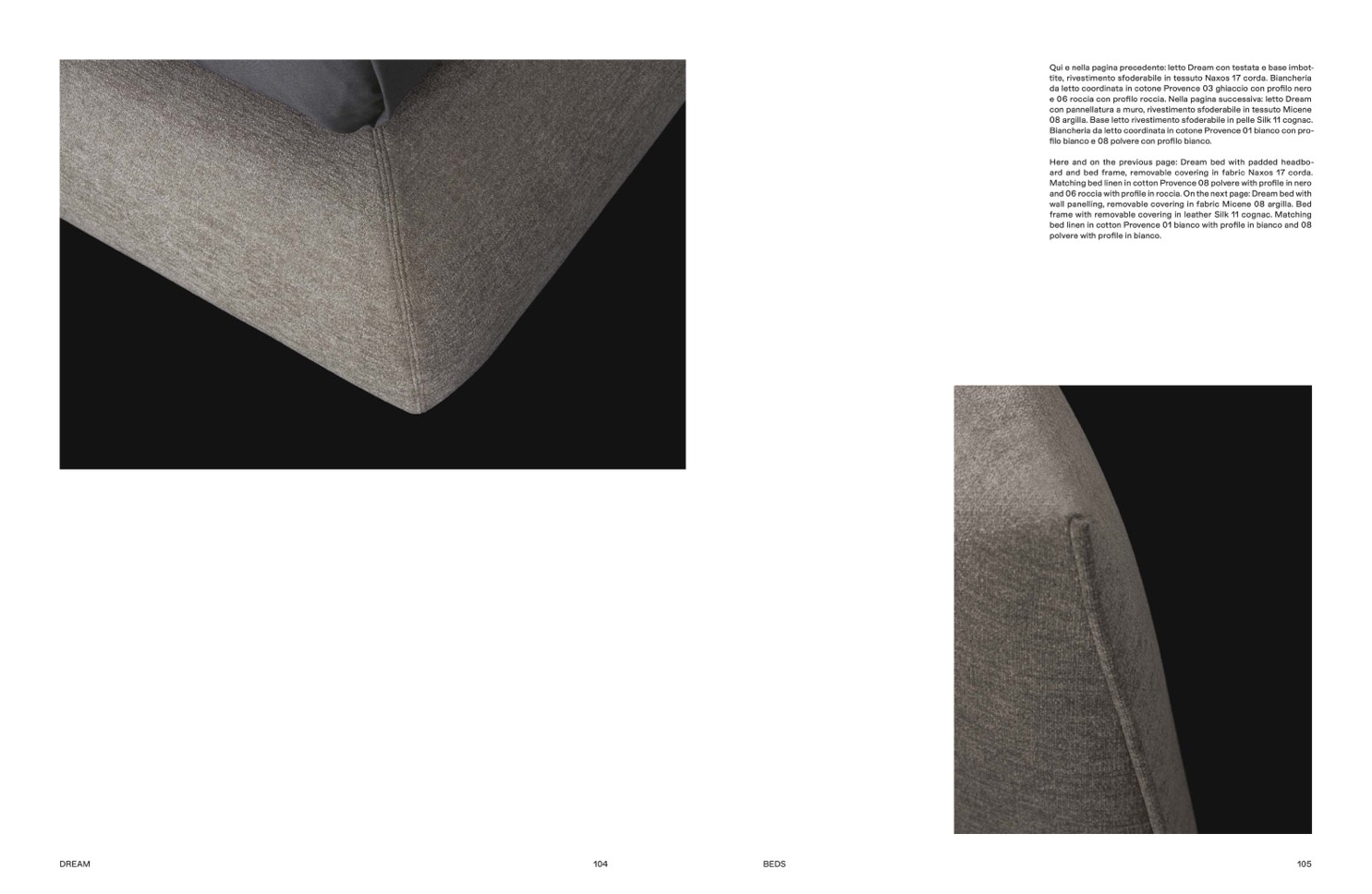 and 06 roccia with profile in roccia. On the next page: Dream bed with