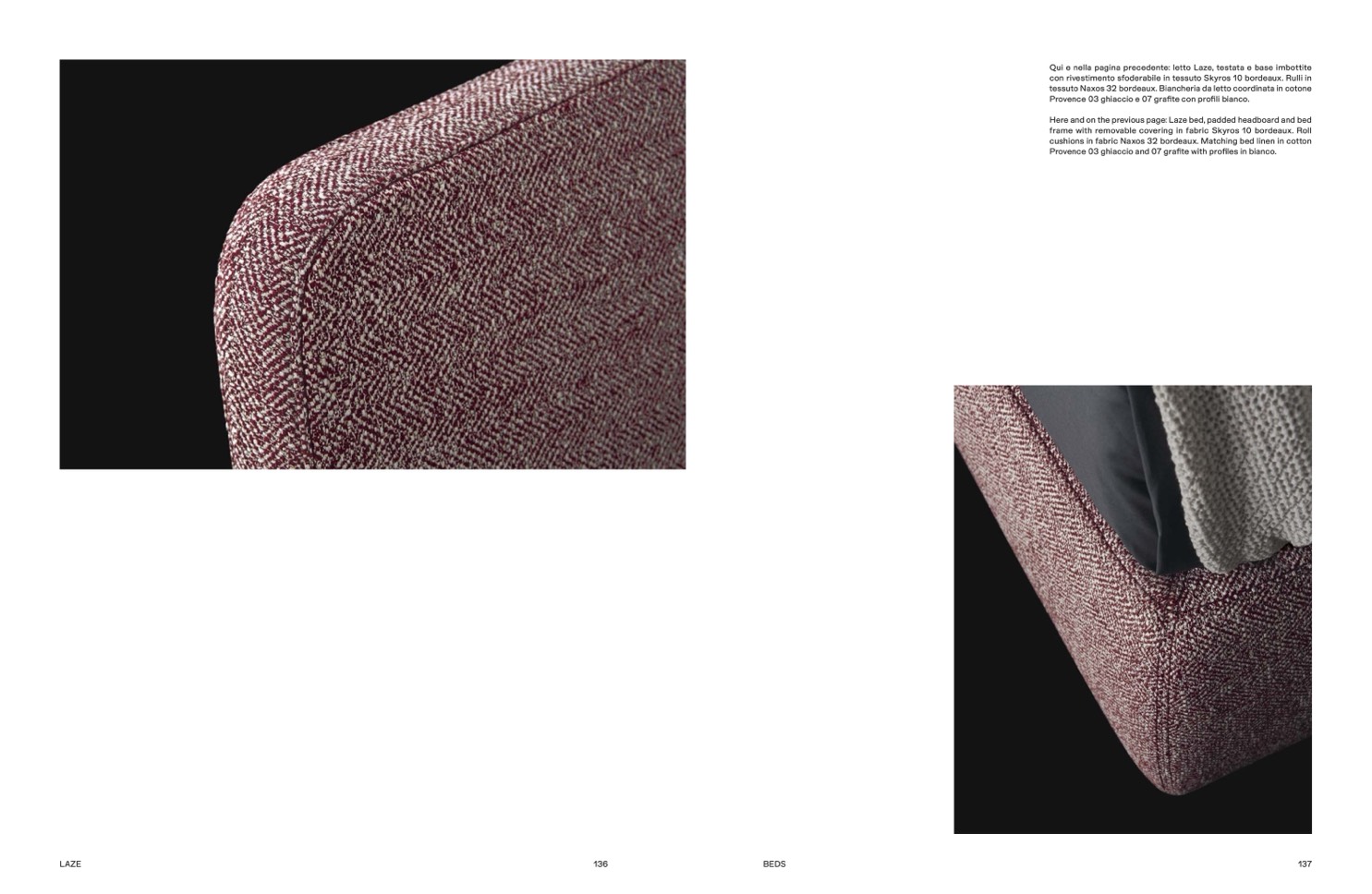 Qui e nella pagina precedente: letto Laze, testata e base imbottite