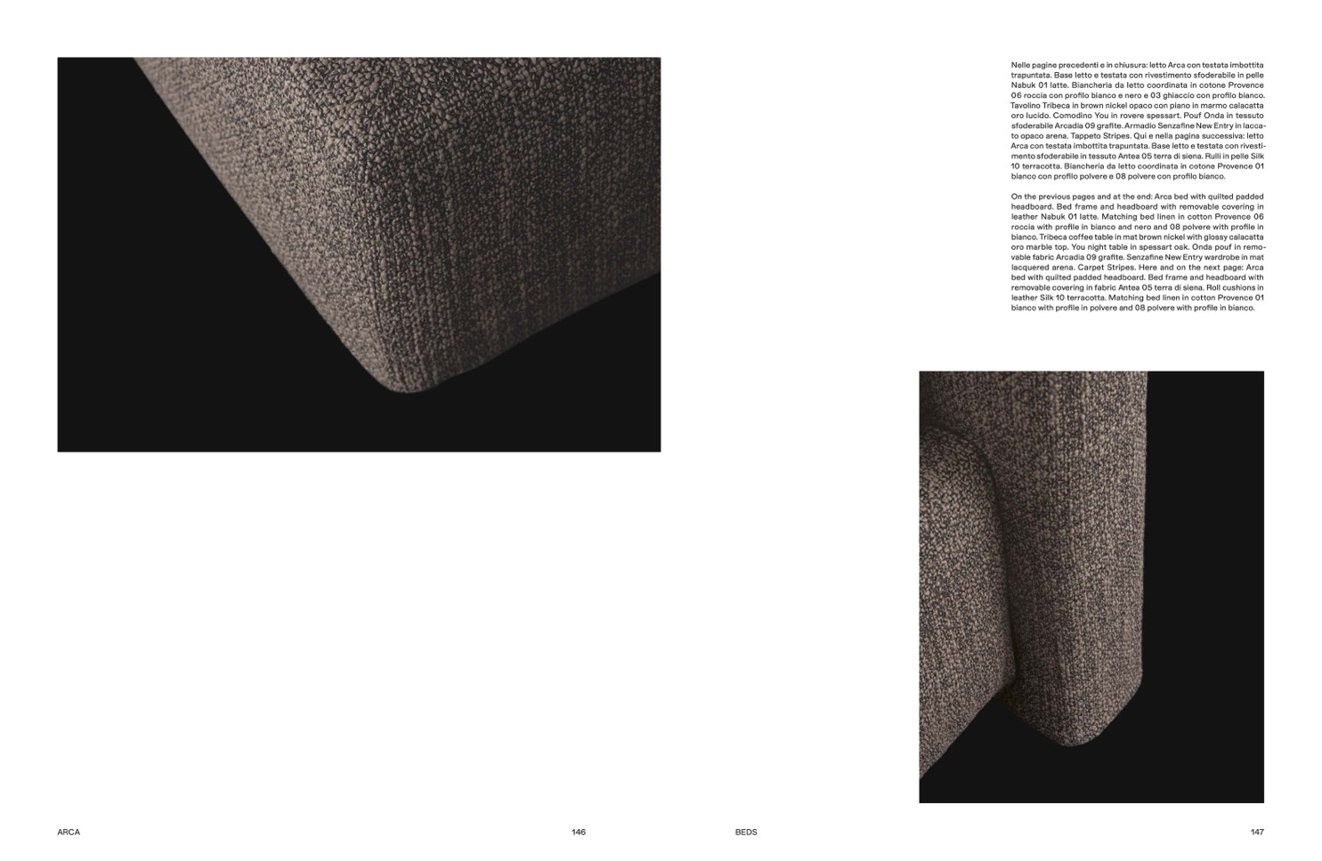 On the previous pages and at the end: Arca bed with quilted padded