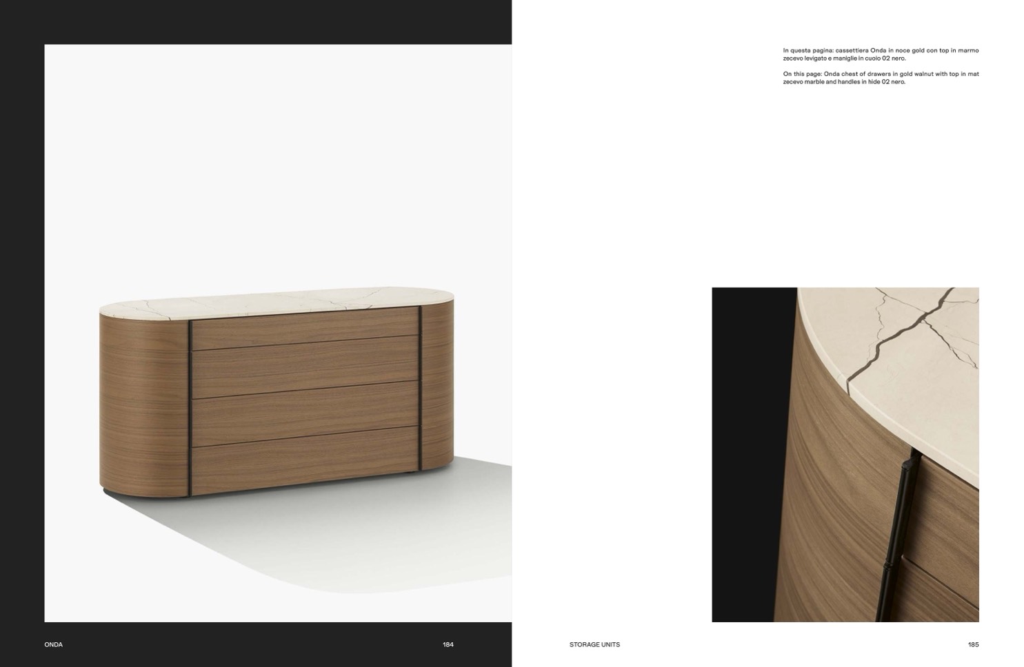 In questa pagina: cassettiera Onda in noce gold con top in marmo
