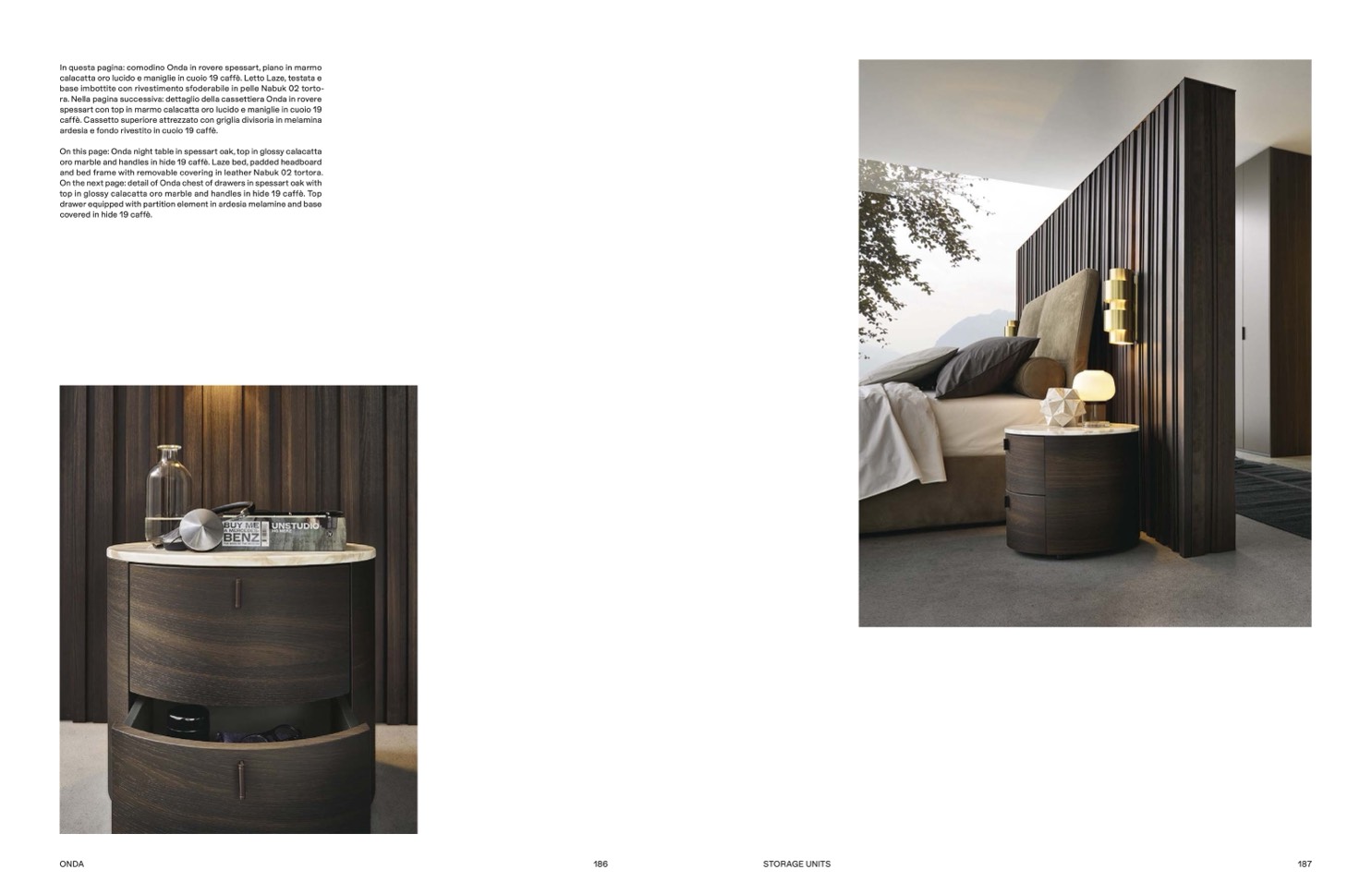On this page: Onda night table in spessart oak, top in glossy calacatta
