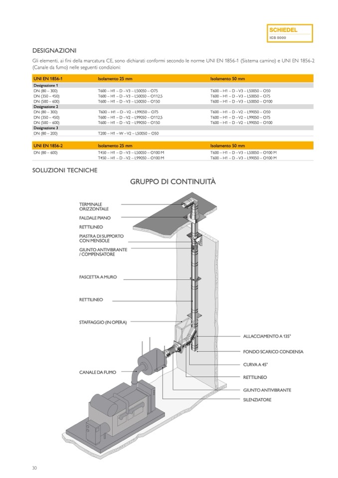 Gli elementi, ai fini della marcatura CE, sono dichiarati conformi secondo le norme UNI EN 1856-1 (Sistema camino) e UNI EN 1856-2