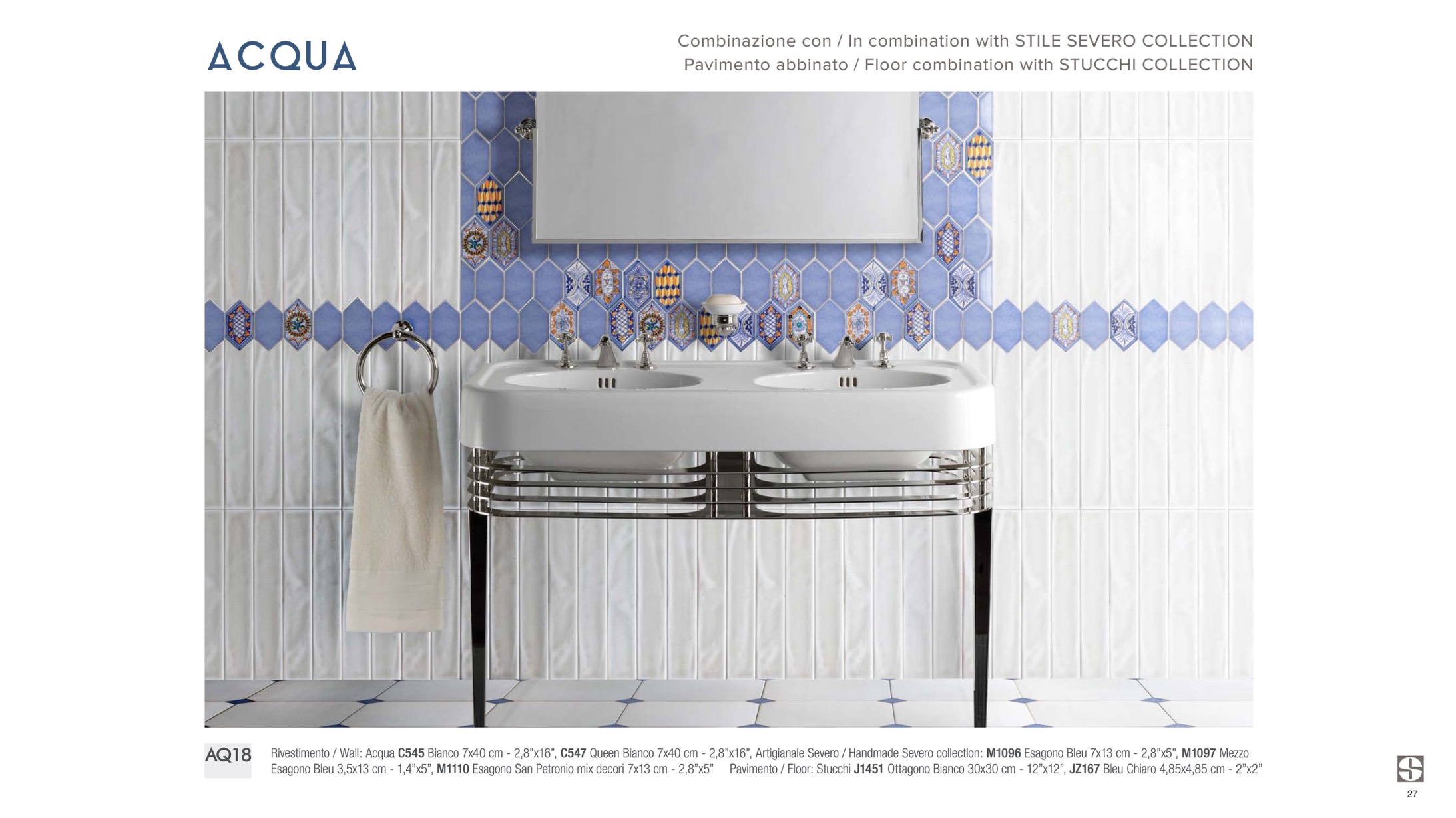 Rivestimento / Wall: Acqua C545 Bianco 7x40 cm - 2,8”x16”, C547 Queen Bianco 7x40 cm - 2,8”x16”, Artigianale Severo / Handmade Severo collection: M1096 Esagono Bleu 7x13 cm - 2,8”x5”, M1097 Mezzo