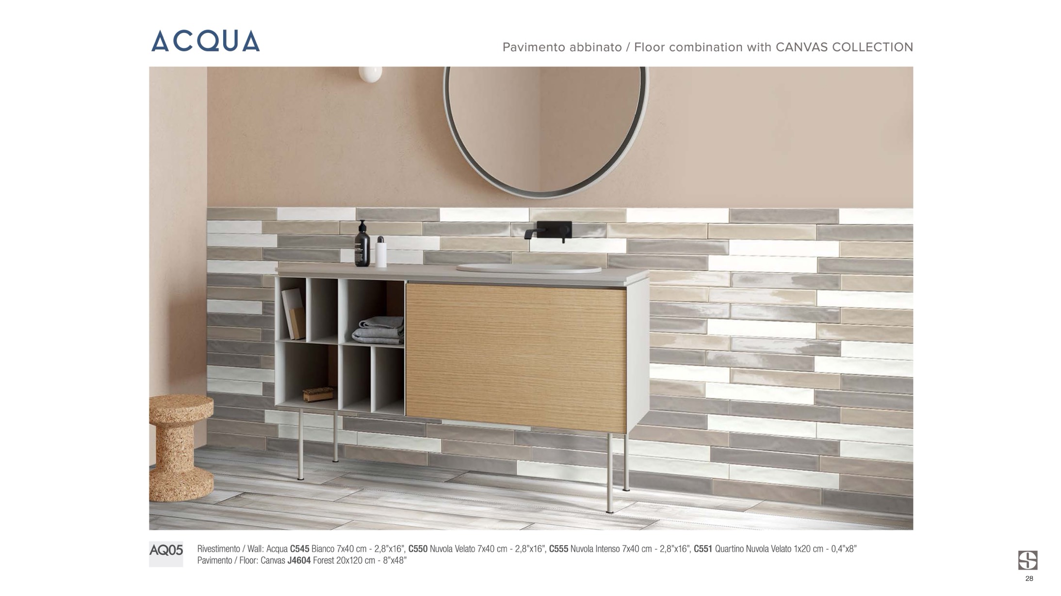 Rivestimento / Wall: Acqua C545 Bianco 7x40 cm - 2,8”x16”, C550 Nuvola Velato 7x40 cm - 2,8”x16”, C555 Nuvola Intenso 7x40 cm - 2,8”x16”, C551 Quartino Nuvola Velato 1x20 cm - 0,4”x8”
