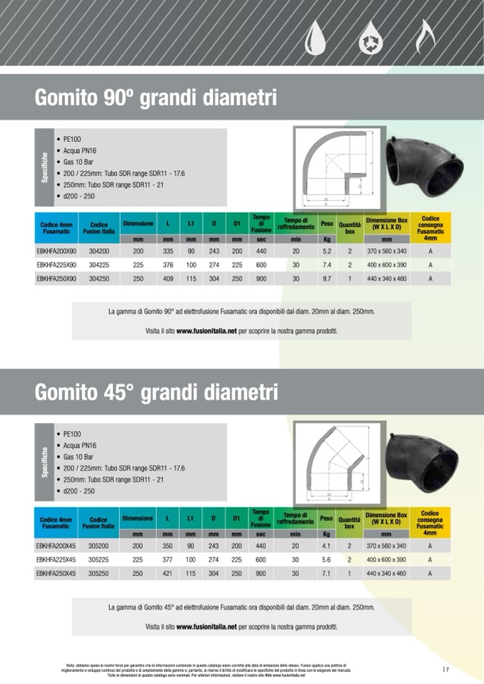 La gamma di Gomito 90° ad elettrofusione Fusamatic ora disponibili dal diam. 20mm al diam. 250mm.