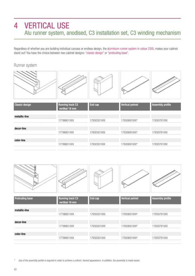 Regardless of whether you are building individual carcass or endless design, the aluminium runner system in colour 230L makes your cabinet