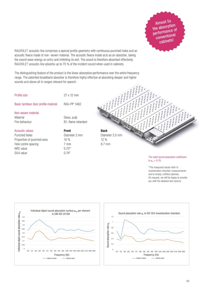 RAUVOLET acoustic-line absorbs up to 70 % of the incident sound when used in cabinets.