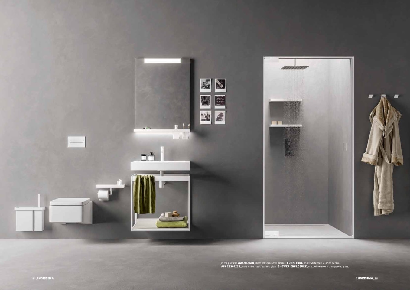 ACCESSORIES_matt white steel / satined glass. SHOWER ENCLOSURE_matt white steel / transparent glass.