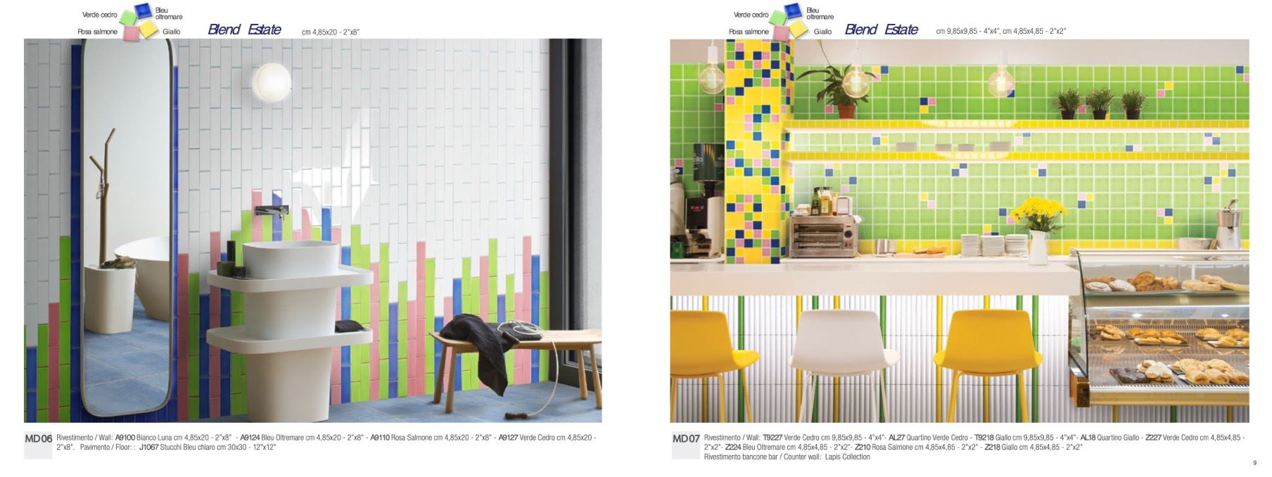 Rivestimento / Wall: A9100 Bianco Luna cm 4,85x20 - 2”x8” - A9124 Bleu Oltremare cm 4,85x20 - 2”x8” - A9110 Rosa Salmone cm 4,85x20 - 2”x8” - A9127 Verde Cedro cm 4,85x20 -