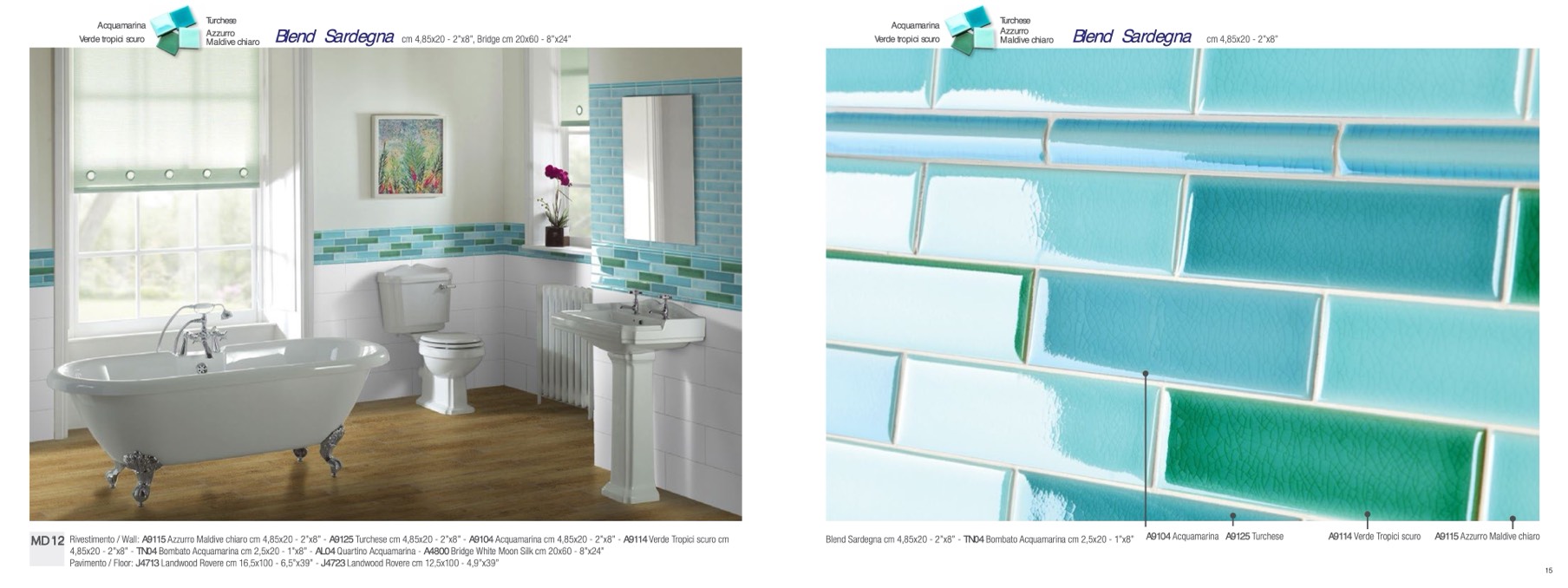 Rivestimento / Wall: A9115 Azzurro Maldive chiaro cm 4,85x20 - 2”x8” - A9125 Turchese cm 4,85x20 - 2”x8” - A9104 Acquamarina cm 4,85x20 - 2”x8” - A9114 Verde Tropici scuro cm