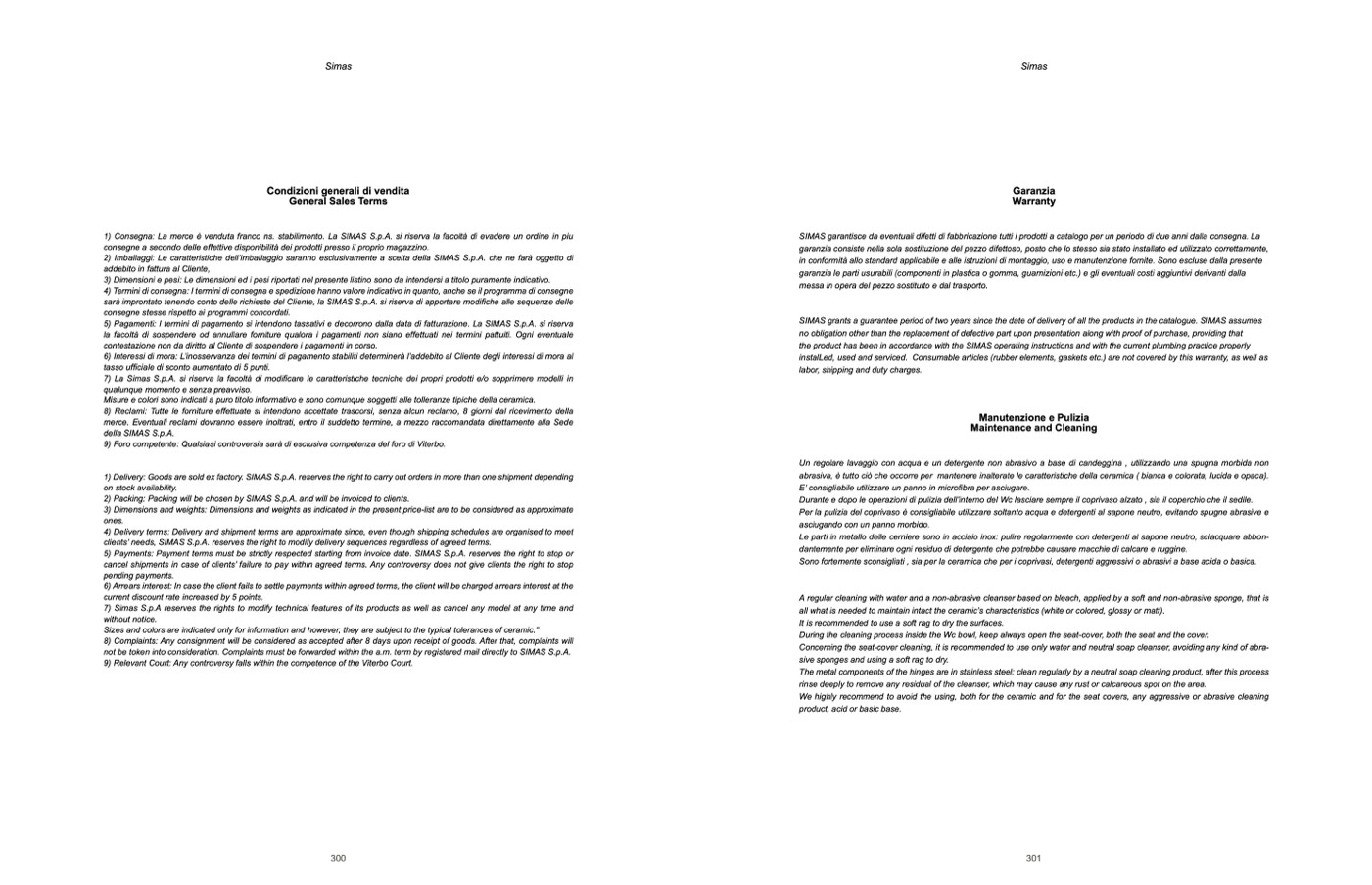 SIMAS garantisce da eventuali difetti di fabbricazione tutti i prodotti a catalogo per un periodo di due anni dalla consegna. La