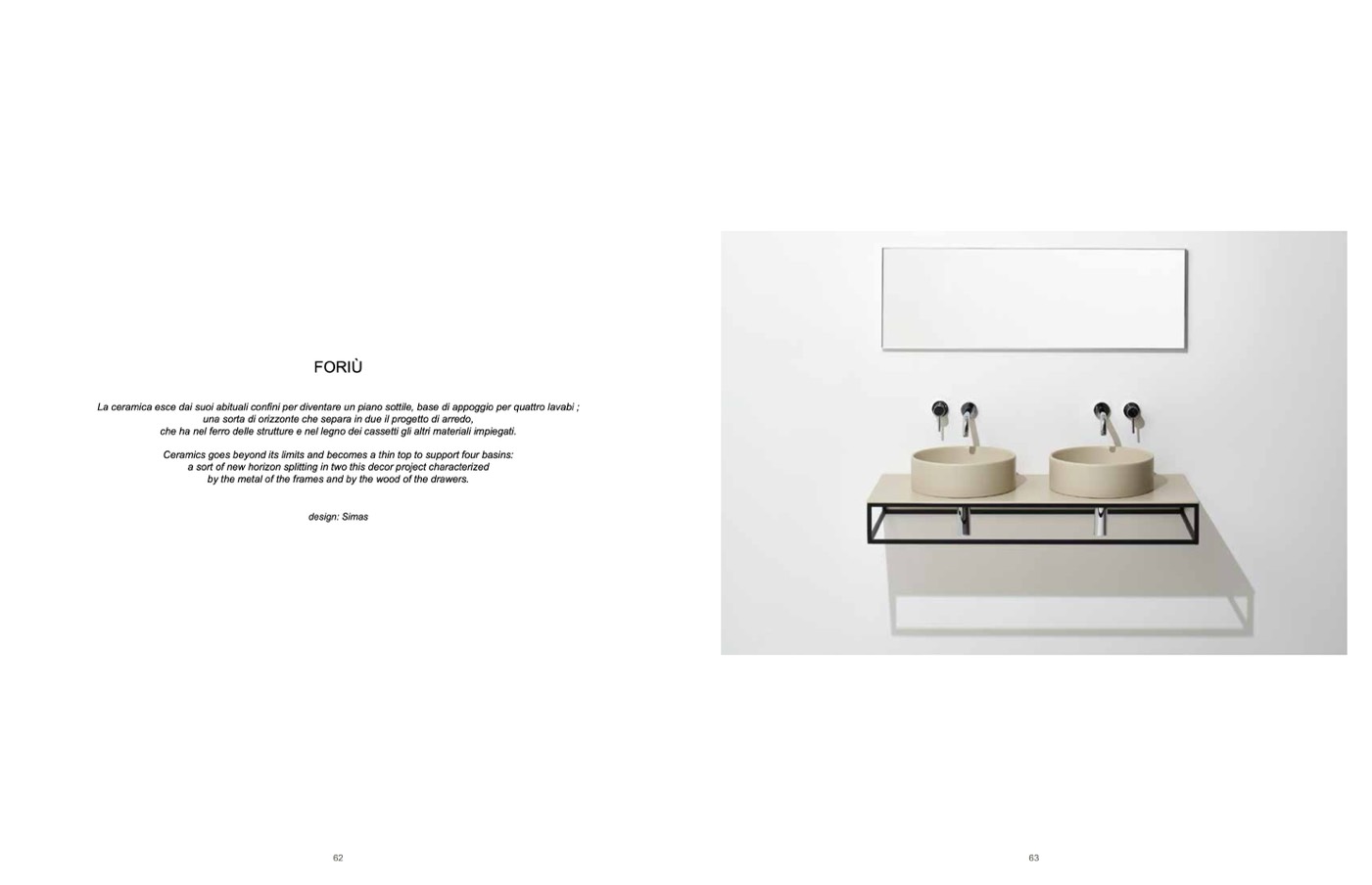Ceramics goes beyond its limits and becomes a thin top to support four basins: