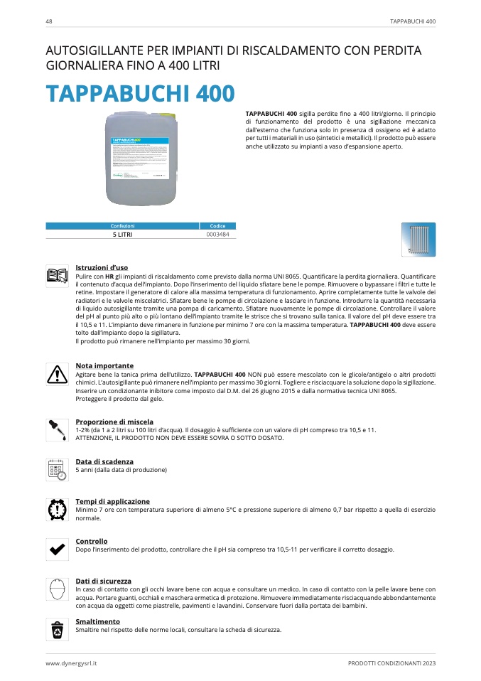 Agitare bene la tanica prima dell’utilizzo. TAPPABUCHI 400 NON può essere mescolato con le glicole/antigelo o altri prodotti