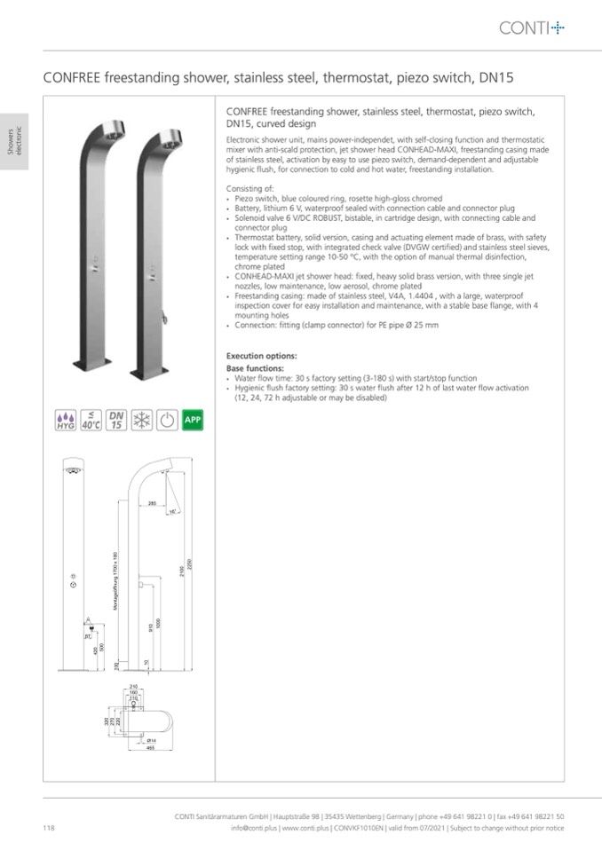 CONFREE freestanding shower, stainless steel, thermostat, piezo switch,