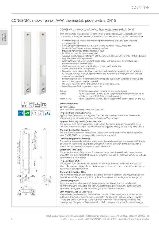 CONGENIAL shower panel, AVW, thermostat, piezo switch, DN15