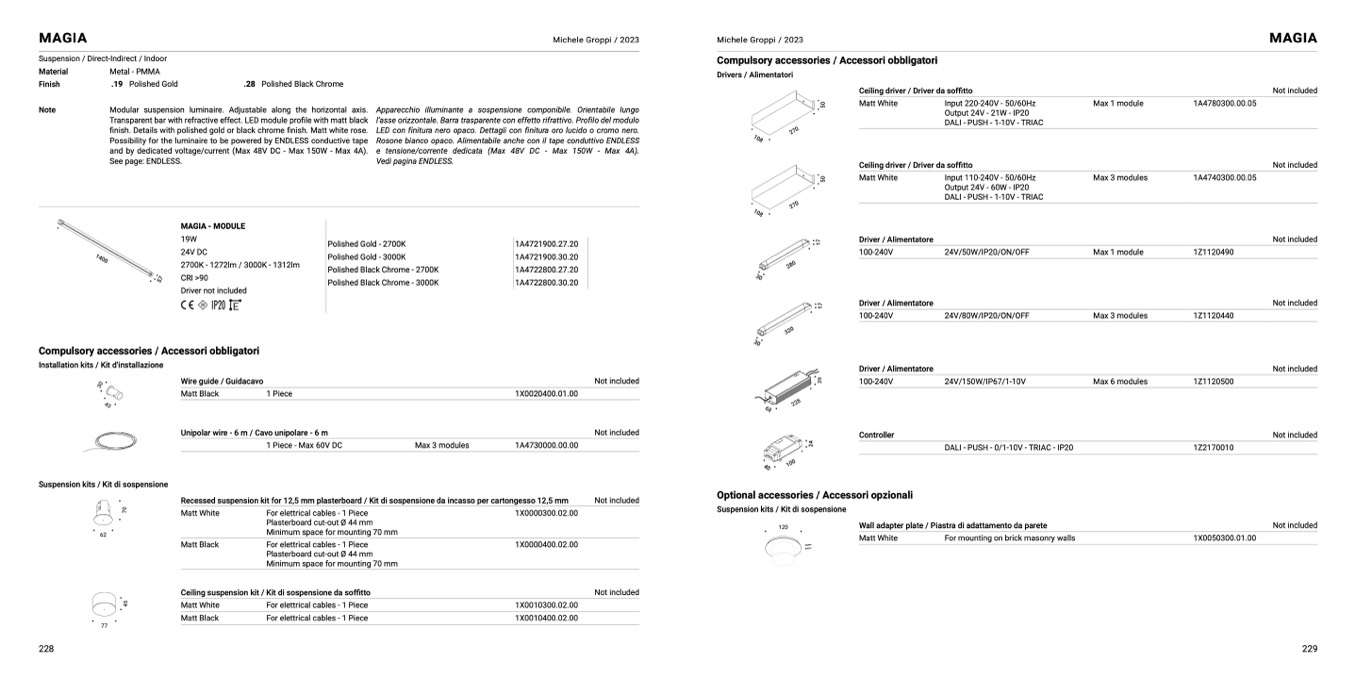LED con finitura nero opaco. Dettagli con finitura oro lucido o cromo nero.